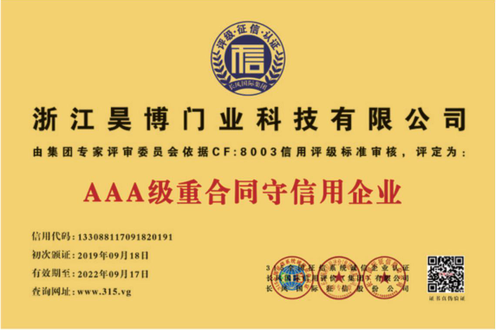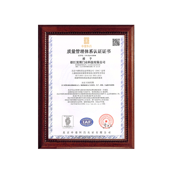 公司一直以來嚴格執行ISO9001質量體系和ISO14001環境管理體系標準,建立了完備的科研、開發、生產、銷售服務體系。公司是浙江省門業協會會員單位,江山門業協會理事單位,中國木材與木制品流通協會會員單位,江山市消防協會副會長單位。